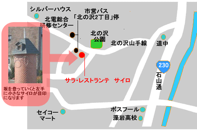 地下鉄南北線・真駒内駅より、南98[じょうてつバス] 道路管理事務所方面行き、約20分「北の沢2丁目」下車(料金210円)歩1分